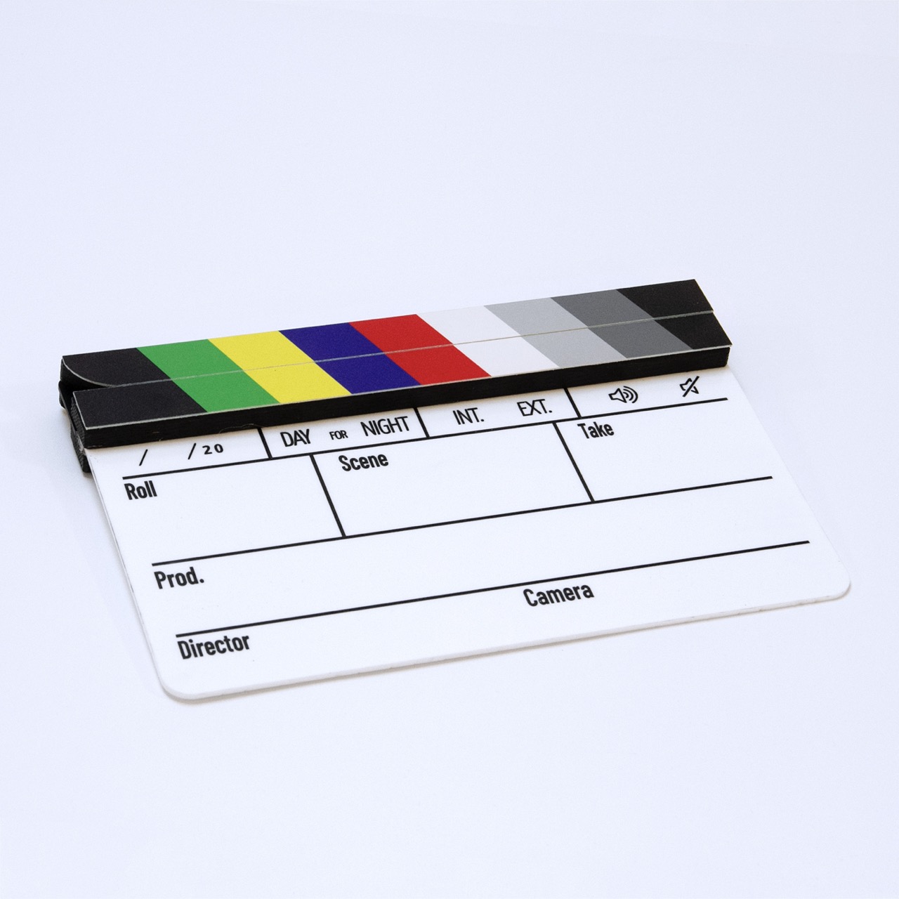 Ratio 2:1 medium film slates is a white plexiglas 3mm engraved and painted black. Wood clapper with UV printed acrylic color bars.